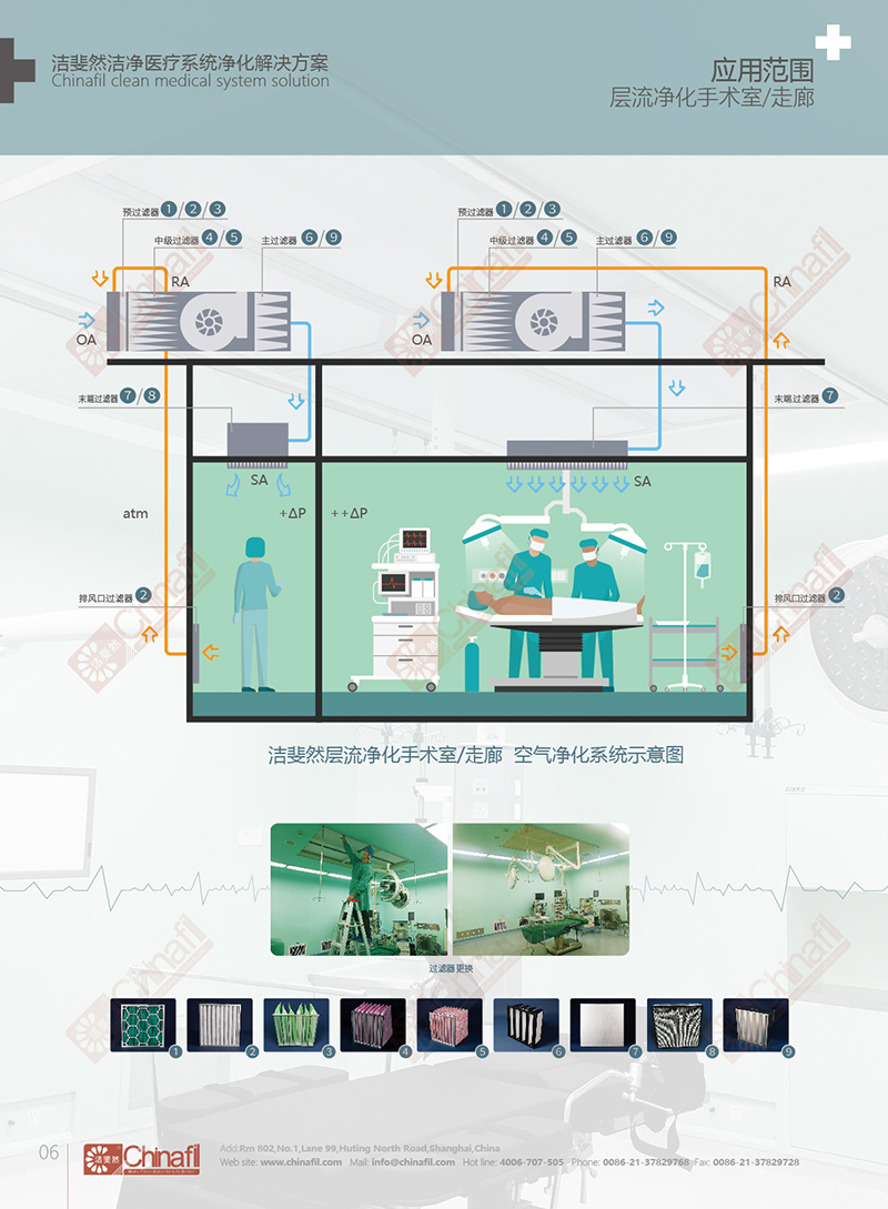 OBCHINAFIL“洁净医疗系统净化解决方案”在手术室净化中主要采用垂直层流式净化通风模式(Supply air ceiling for operating theatre),在空调/通风系统前端设置有多级空气预过滤(如图❶❷❸❹❺❻❾),并将无隔板高效过滤器设置在手术台正上方(❼),过滤后的洁净空气通过均流膜以均匀的流速向预设的方向输送,且保持微正压,持续确保手术台达到相应的洁净要求,排风系统的回风口通常设在墙面的四角。此外,在通往手术室的走廊也设置有相应级别的空气过滤器(❼❽),以保证手术室的洁净。