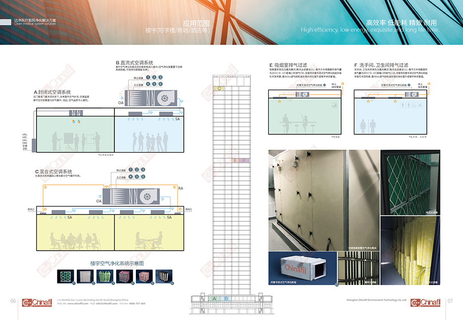 OBCHINAFIL“楼宇空气净化解决方案”在楼宇中的应用,以B/直流式和C/混合式系统通风模式为例,空气净化设备装置于空调/通风系统前端,室外风(OA)通过多级空气过滤(如下图❶❷❸❹❺❻)达到洁净标准,通过空调设备调节温度后再经气流通道输送到各个空间(SA),且保持室内微正压。在C/混合式系统中每个送风空间都设有排风(RA)通道,排风系统可回收空气中的热能或“冷能”以环保节能利用,所排空气将与室外风一起重新进入空气过滤环节,净化设备装置捕获颗粒物、微生物、病菌等有害物质,并且阻止它们进入空调系统(空调箱体空气过滤)。因此,不会发生因某个回风空间空气污染而造成整个循环用风交叉感染的情况。